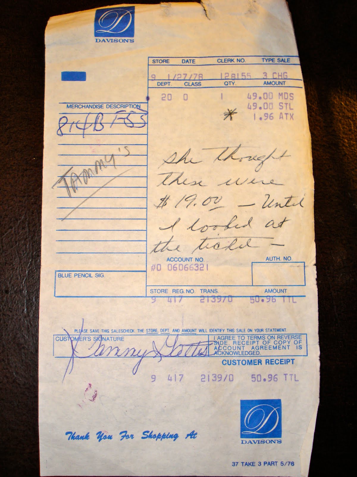 She didn't say a word until a couple of weeks after the event (which I can't even remember what it was now) when she showed me the receipt––that I had signed, mind you. The shoes weren't $19.00. They were $49.00! And that sweet woman had let me keep them. (For those of you who are younger, that's like $1497.62 in today dollars.)