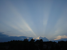 We took turns and everyone fished (that's my Dad fishing and Joe supervising). No one else caught anything, but it was so pretty outside, we didn't care. Jack zonked out on a nearby bench with our kids, and as the day faded, I snapped a picture of the sunset. I hope it shows up well enough to capture the sun's final rays...