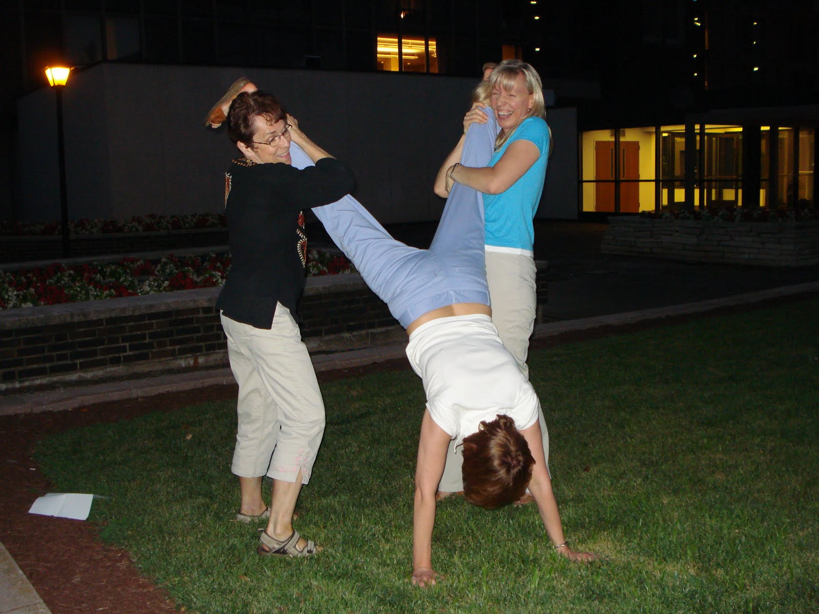 We had a scavenger hunt during the writers retreat, and one of the "to dos" was to have one member of your group do a cartwheel. Well...this is Lynn Austin attempting a cartwheel with the help of Neta Jackson and Julie Klassen. Teamwork almost made it happen! :)