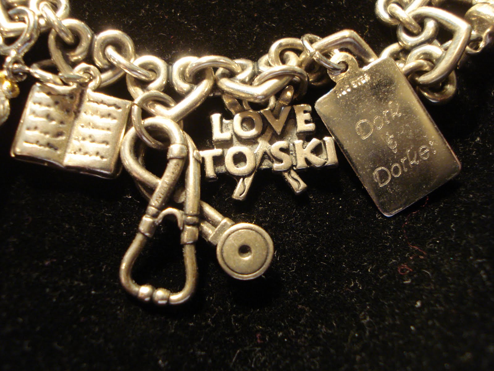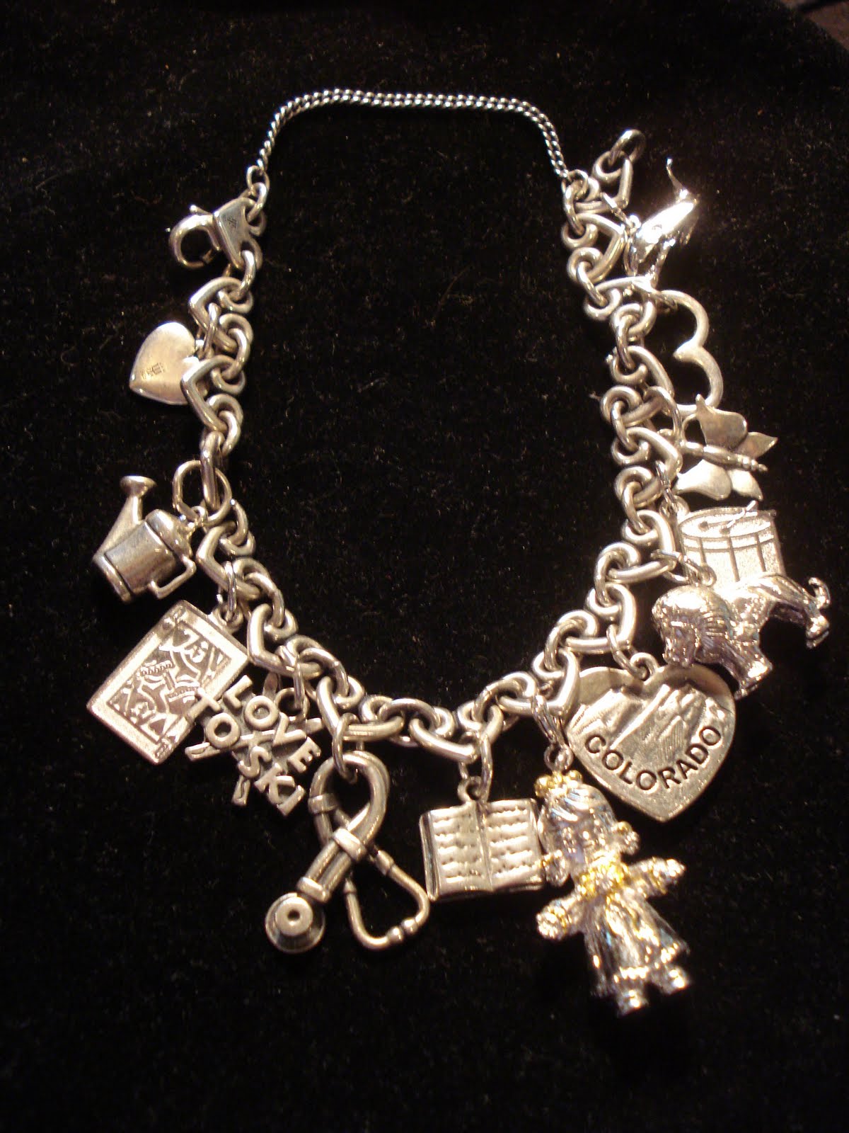 This is a charm bracelet that a group of dear friends in Colorado gave me before my family and I left Colorado for Tennessee in 2007. Each charm represents someone special to me and a special relationship that I treasure! Each charm also tells a story, and here are just a few of the stories "attached" to this bracelet...