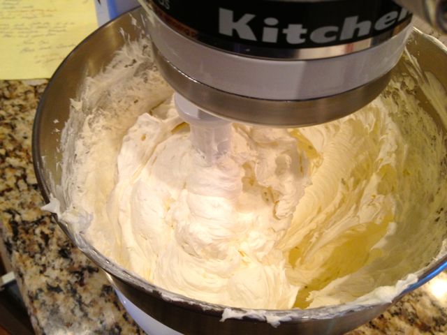 As that's cooling, take your cream cheese mixture from the fridge and spread that into your pie crust...