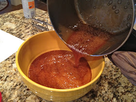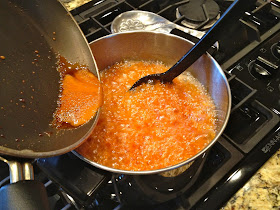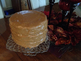 Next came making the burnt caramel icing. Mmmm.... But! you know those disclaimers they put on commercials were a professional driver is road racing, like: "PROFESSIONAL DRIVER! CLOSED ROADWAY! DO NOT ATTEMPT THIS AT HOME." That's what someone should've told me so I would've been more cautious. LOL! So a word to the wise, do not answer your cell phone during this stage. Do not pause to let your dog go outside because he sees a squirrel and is going berserk! Do not do anything but mind this icing. Just sayin'...