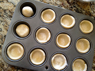 I've made my dough and am pressing it into the tiny muffin tins with the dowel. You can see how I simply "ball up" the dough, pop it into the tin, then gently press the floured dowel down to make the shell.