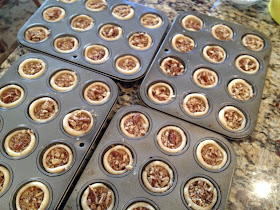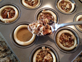 Next, I spoon a teaspoon of chopped pecans into each tassie. If you don't eat the chopped pecans, this goes much faster.